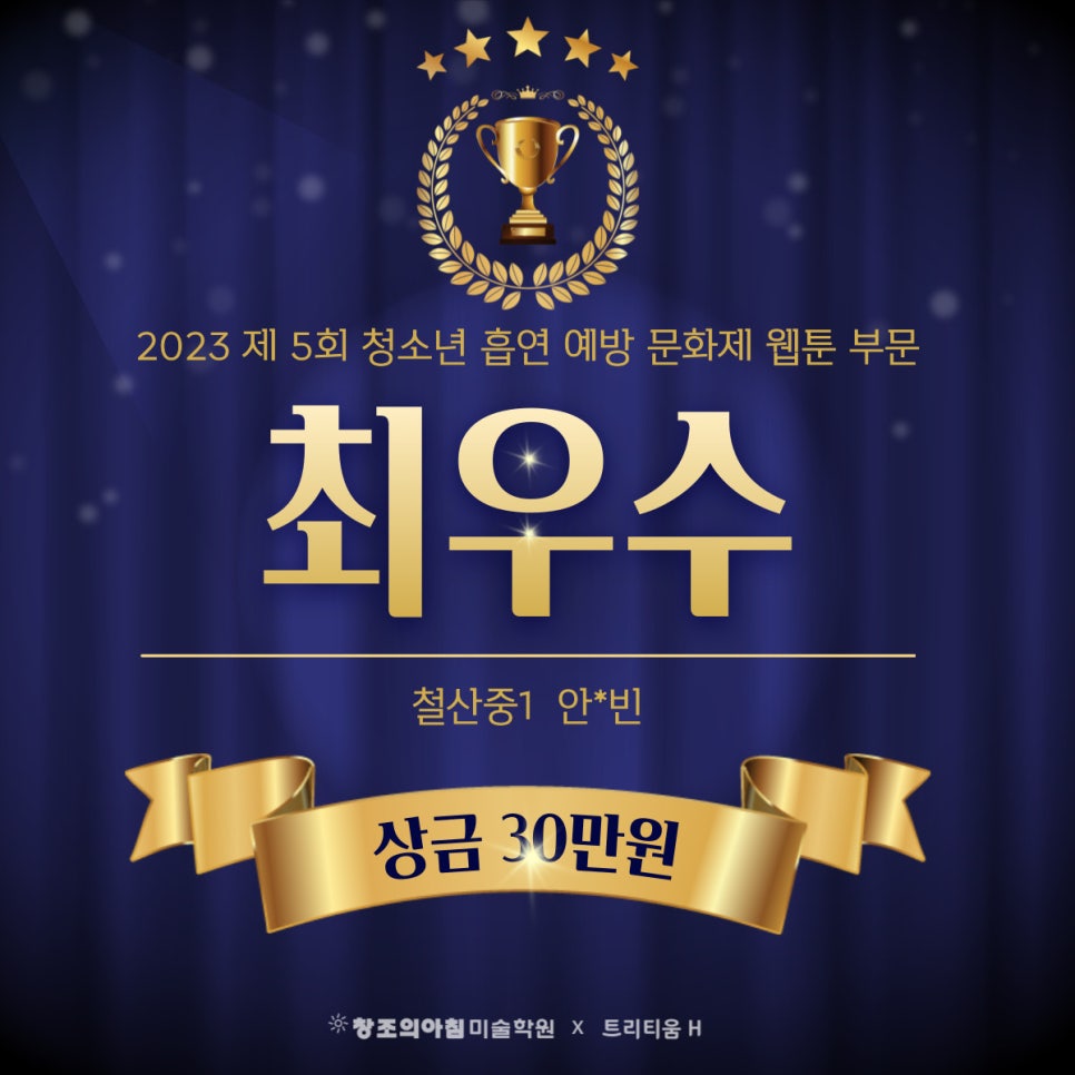 NOTICE 수상자&합격자 트리티움H미술학원 수상자&합격자 소식 결과로 증명하는 교육, 합격과 수상의 순간을 전합니다. 제16회 전국 세대공감 사랑과 효공모전 금상 수상 2026-03-04 제16회 전국 세대공감 사랑과 효공모전 금상 수상 2026-03-04 제16회 전국 세대공감 사랑과 효 공모전 대상 수상 2026-03-04 제4회 운암 김성숙 UCC및 4컷웹툰 공모전 대상(상금100만원) 수상 2026-03-04 2023 대한해부학회 우리몸그리기대회 우수상 수상 2026-03-04 23년 산림문화작품공모전 최우수 수상 2026-03-04 2023 제5회 청소년흡연예방 문화제 웹툰 부문 최우수상 수상 2026-03-04 2023 학교안전포스터 공모전 우수상 수상 2026-03-04 2023 학교안전포스터 공모전 대상 수상 2026-03-04 2023 제11회 전국 수원화성 그리기 공모전 우수상 수상 2026-03-04 2023 제11회 전국 수원화성 그리기 공모전 최우수 수상 2026-03-04 2023 제15회 전국 세대공감 사랑과 효 공모전 금상 수상 2026-03-04 Previous Page1 Page2 Page3 Page4 Page5 Next