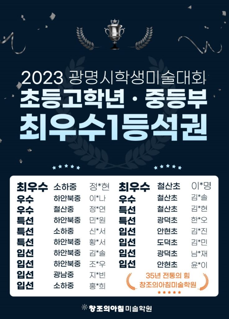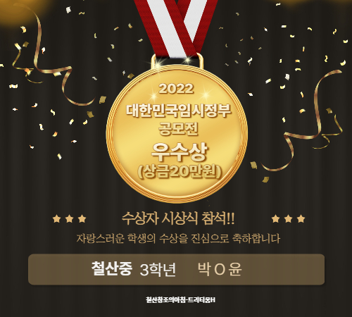 NOTICE 수상자&합격자 트리티움H미술학원 수상자&합격자 소식 결과로 증명하는 교육, 합격과 수상의 순간을 전합니다. 2023 제15회 전국세대공감 사랑과 효 공모전 대상 수상 2026-03-04 2023 광명시학생미술대회 초등고학년/중등부 최우수1등 석권 2026-03-04 자생의료재단 독립운동가콘텐츠 공모전 금상(상금100만원)수상 2026-03-04 2022 제10회 사랑의열매 나눔공모전 시도교육감상 수상 2026-03-04 2022 제25회 우리은행실기대회 동상 수상 2026-03-04 2022 제14회 하늘사랑공모전 동상 수상 2026-03-04 2022대한민국임시정부공모전 우수상 수상 2024-09-17 삼성전자, 3나노미터 칩 양산 시작 2024-09-13 AI 스타트업 붐, 글로벌 투자 증가 2024-09-13 Previous Page1 Page2 Page3 Page4 Page5 Next